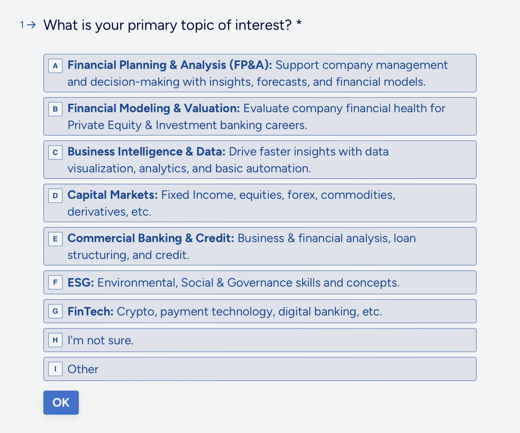 For Question 1, topic of interest, we categorized each learner’s responses based on if they selected either one of seven Specific Topics (e.g. Financial Planning & Analysis) or Not Sure / Other.