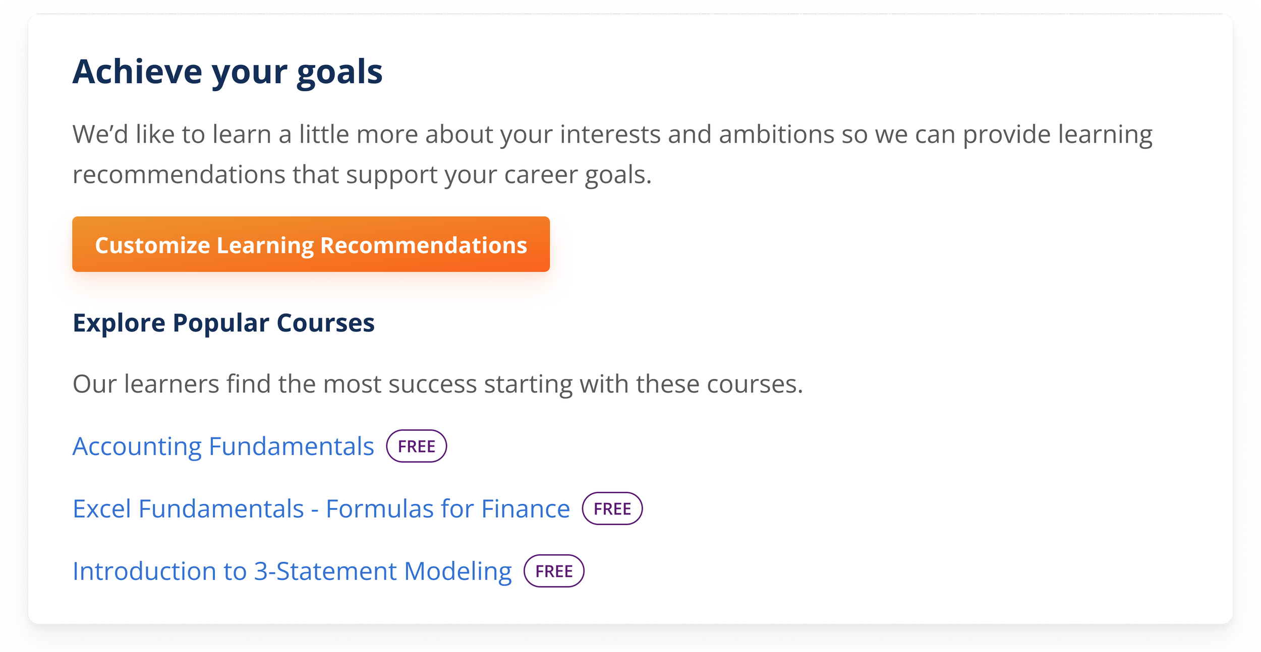 For learners who dismissed the welcome survey, our primary recommendation is to take the survey so we can help guide them on the first steps of their learning journey with CFI. As outlined above, the customized recommendations they’ll receive after the onboarding survey should will help lead learners toward converting to a paid subscription.