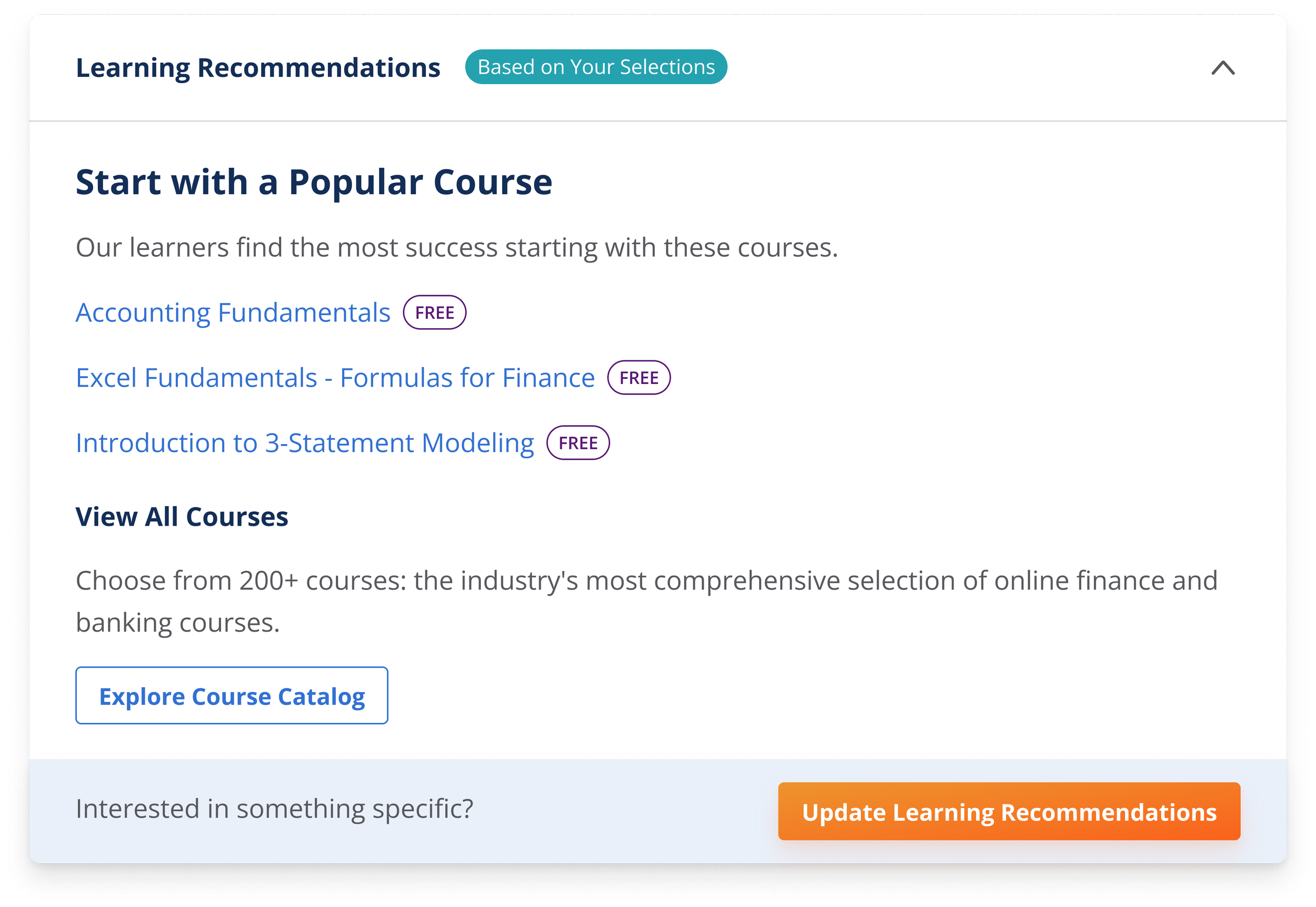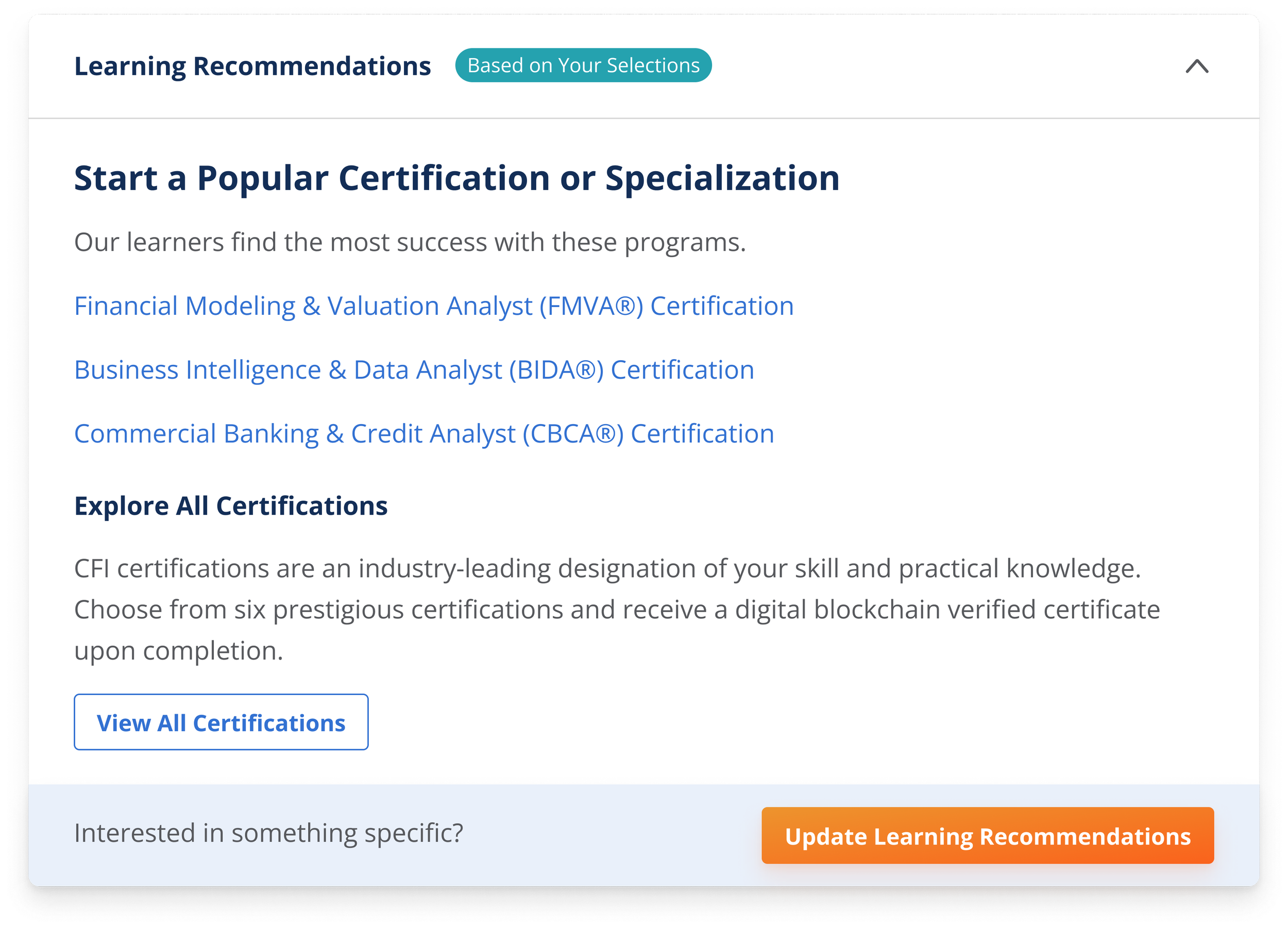 If a learner is not sure about which topic but would like to take individual courses or explore their options we’ll recommend a variety of free, entry-level, popular courses from across CFI’s catalog.