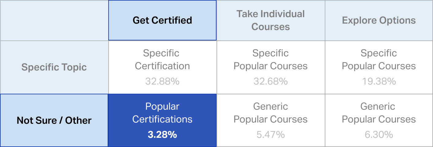 In the most rare case in which a learner is not sure about which topic to study but would like a certification, we’ll recommend the most popular certifications.