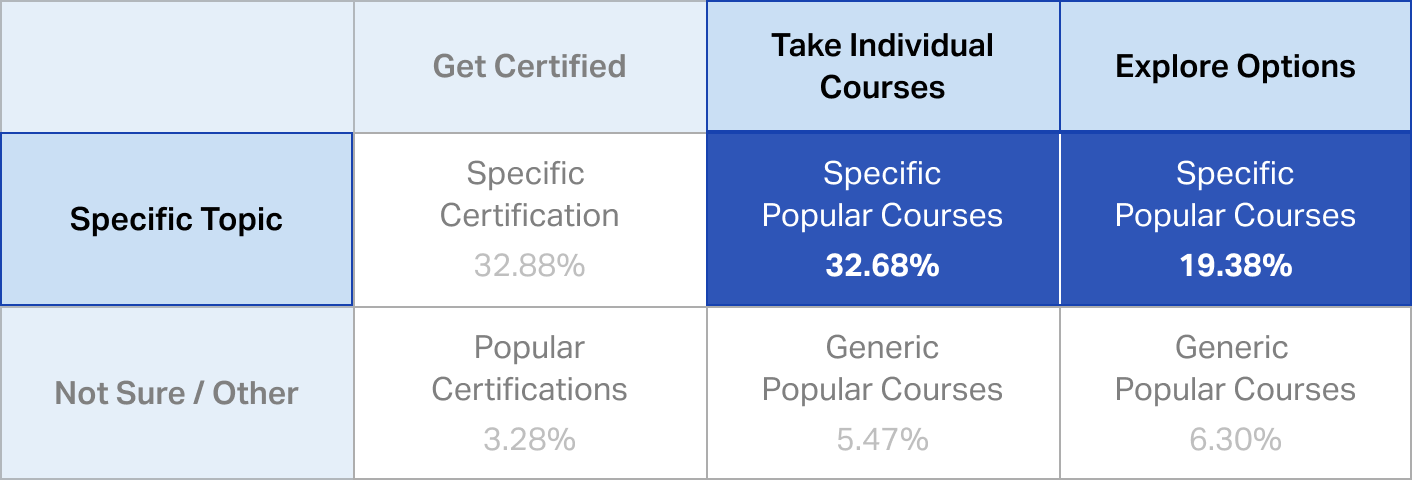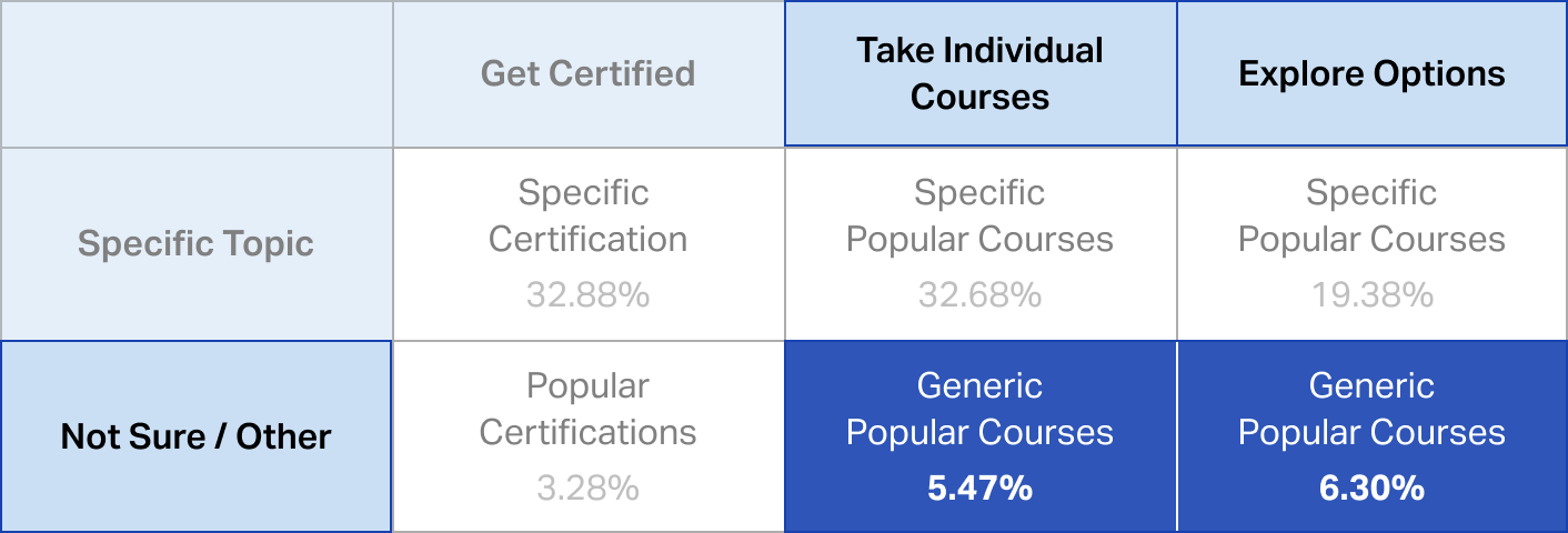 We provided the same recommendation for learners with matching topics of interest who wanted to either take individual courses or explore their options. Learners who are still exploring options may be intimidated by an entire certification, and starting with an individual course is more approachable.