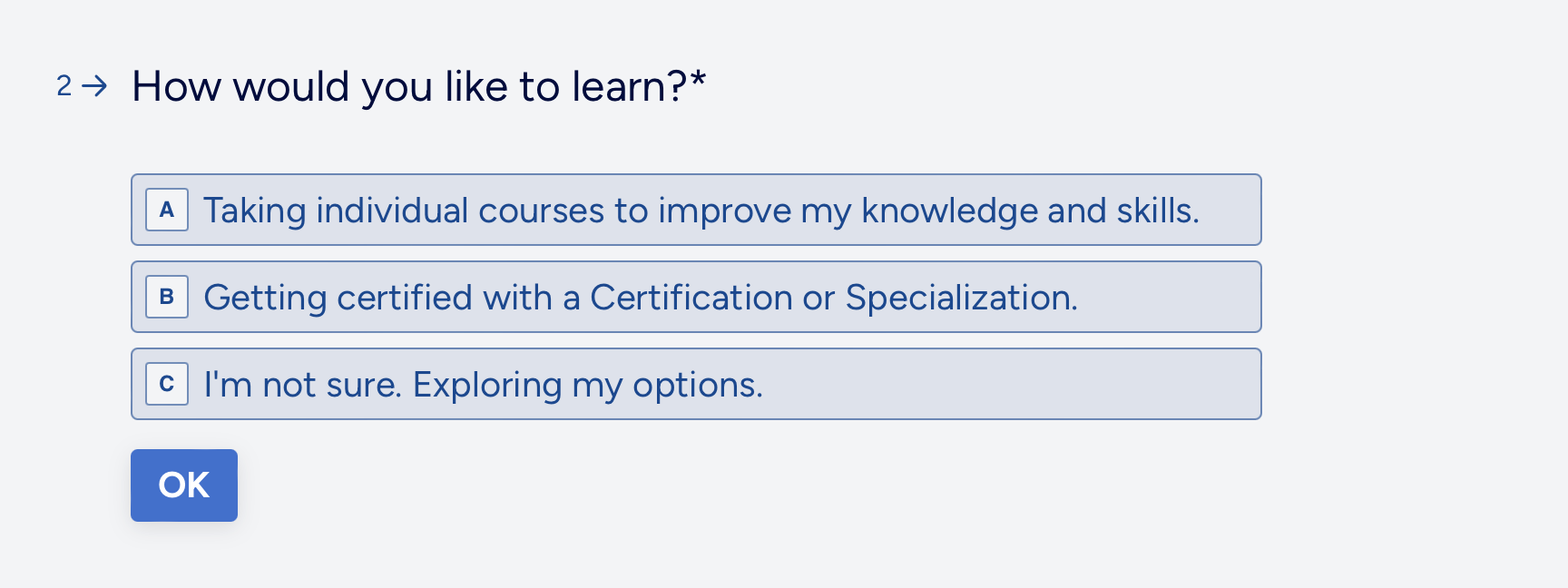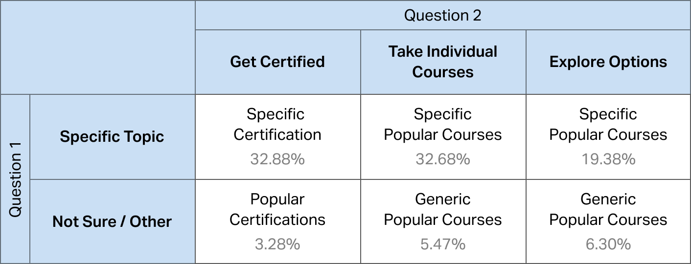 In the most common scenario, a learner indicates that they’re interested in a specific topic and a certification, and we’ll recommend the certification that aligns with their selected topic. There are seven versions of this recommendation, each corresponding to a topic available in the survey and its respective certification.