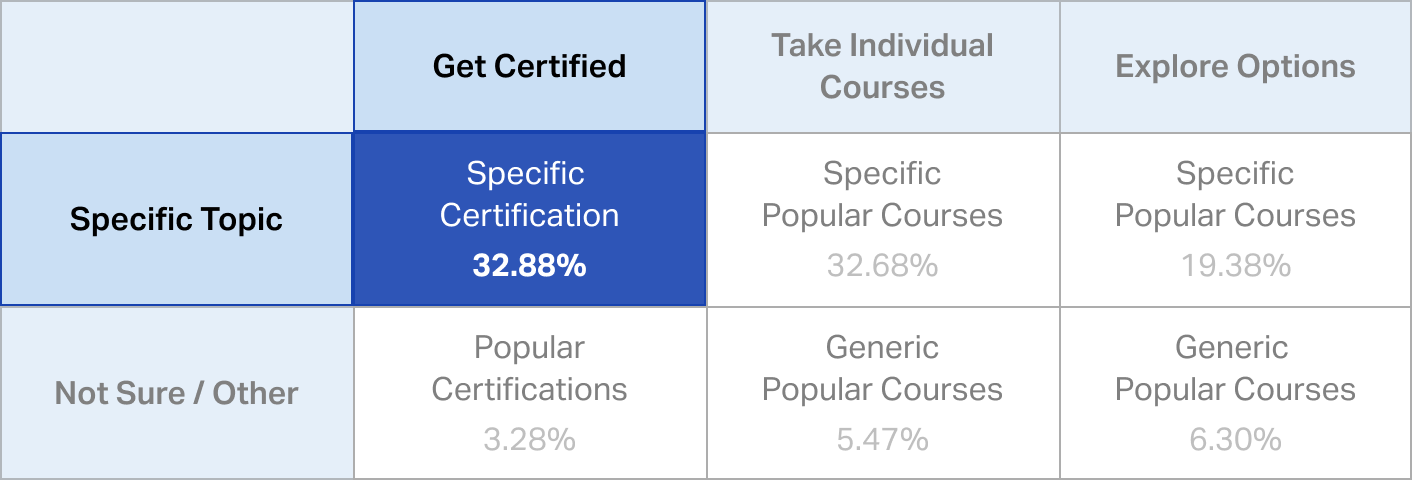 We also considered learning style with Question 2: whether a learner aspires to Get Certified, Take Individual Courses, or Explore Their Options.