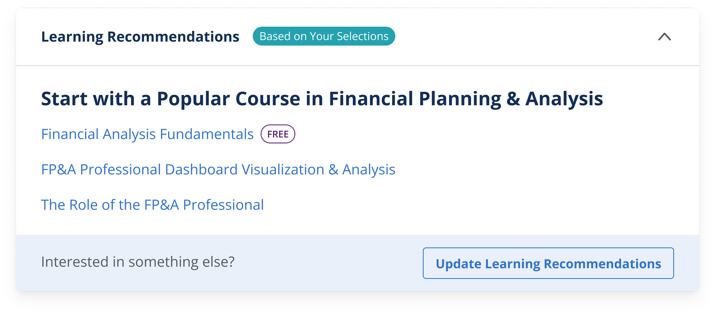 Each Learning Recommendation includes a header featuring the tag “Based on Your Selections”, which indicates that these recommendations are customized. Additionally, the icon in the top right of the header allows a learner to collapse this section.