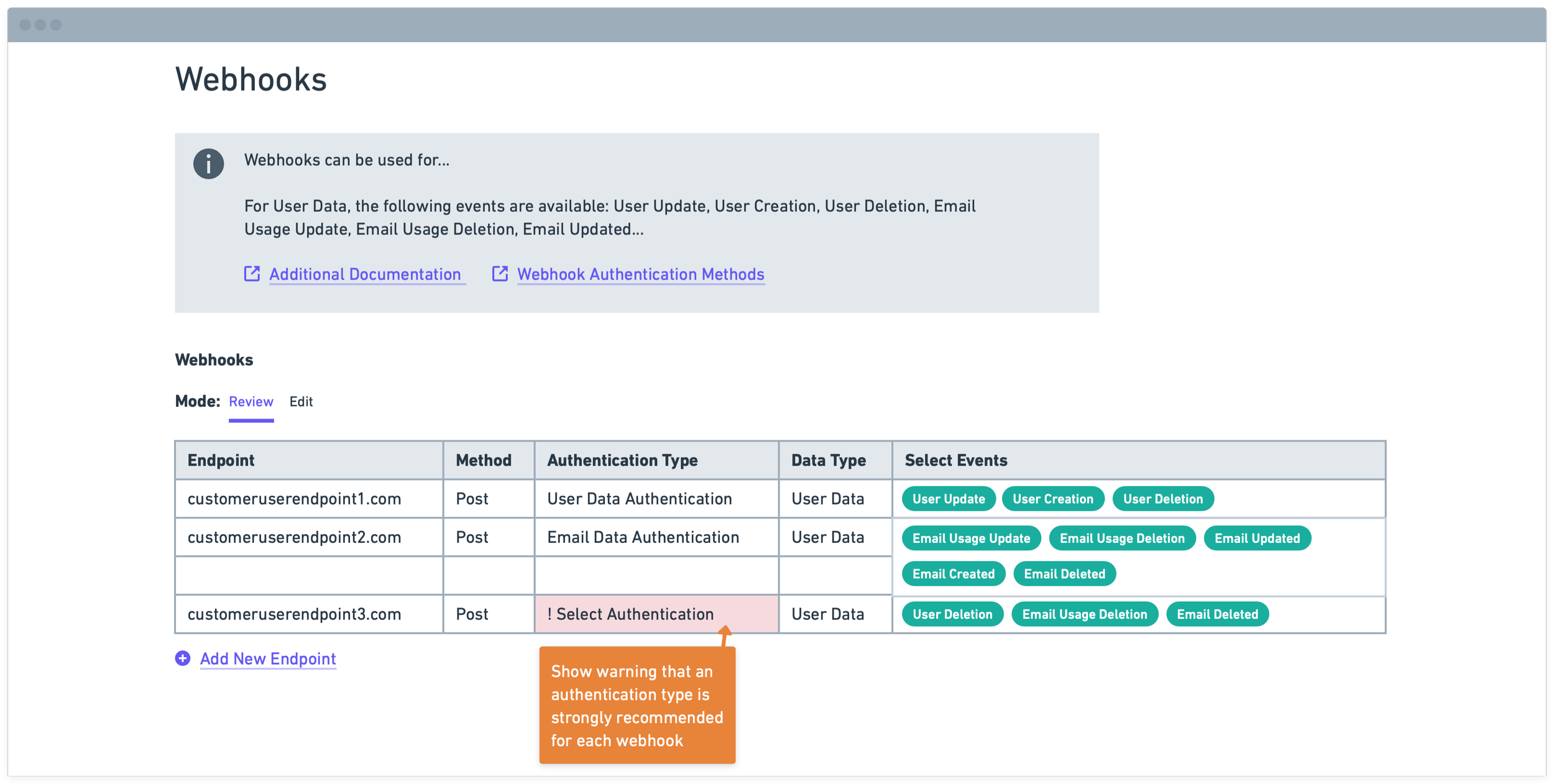 Beneath the table, this page also includes a CTA to add a new endpoint.