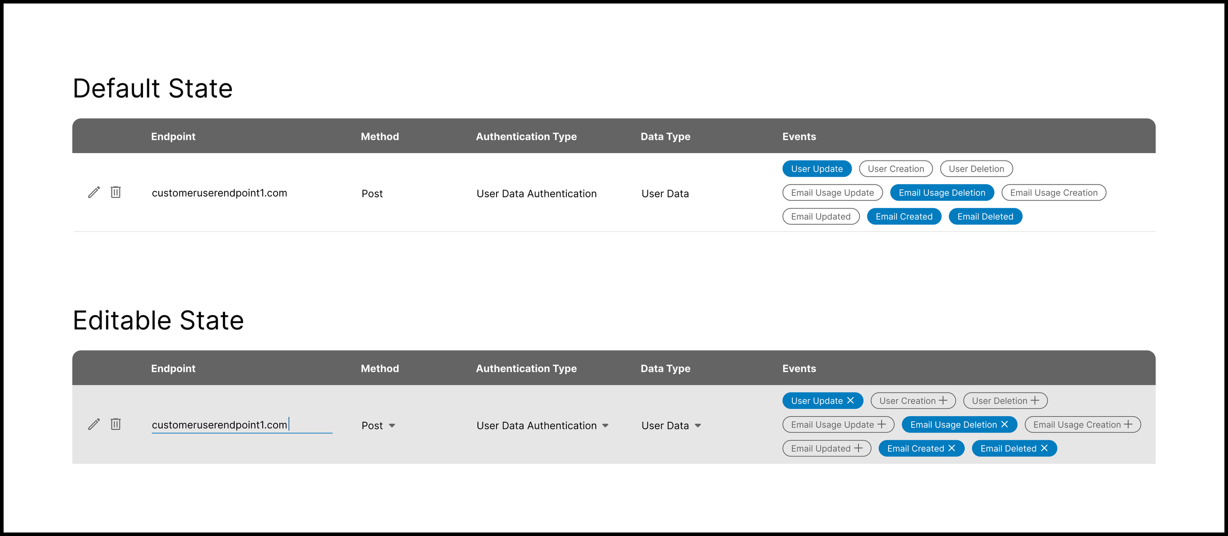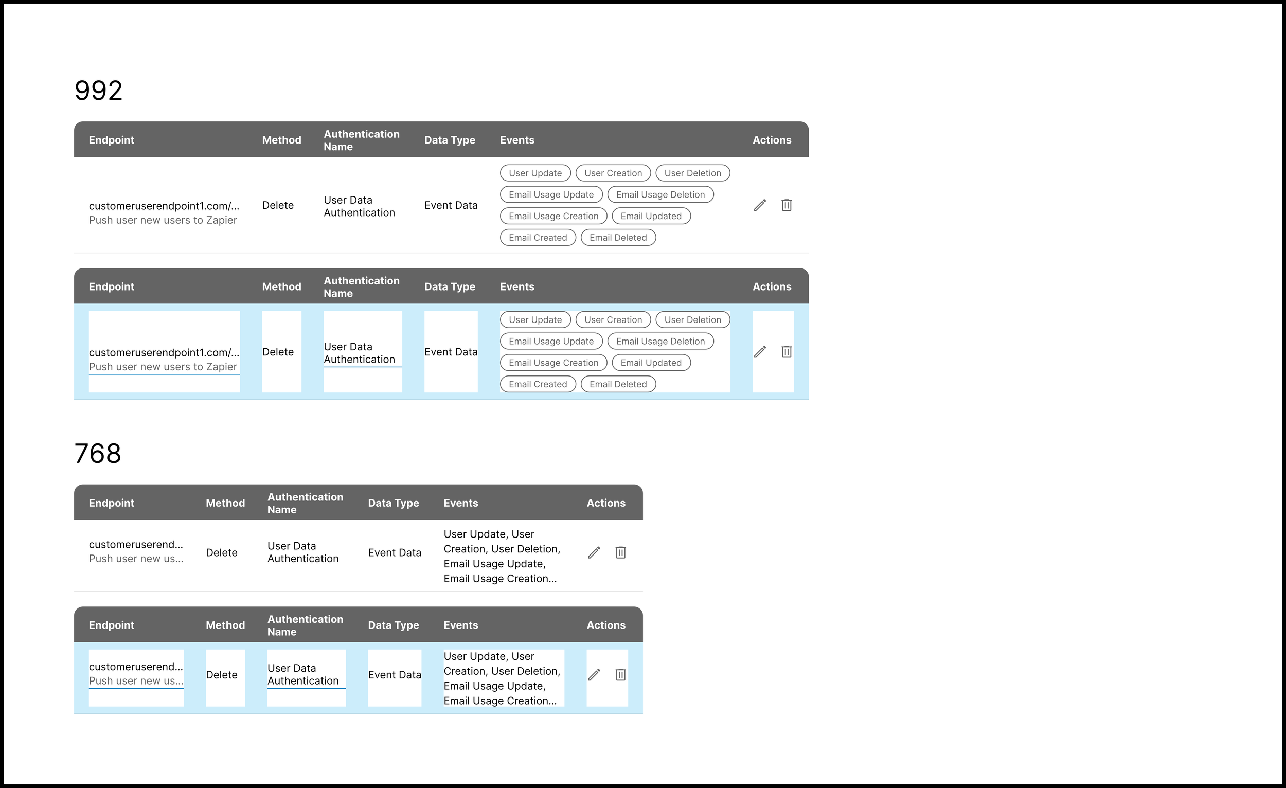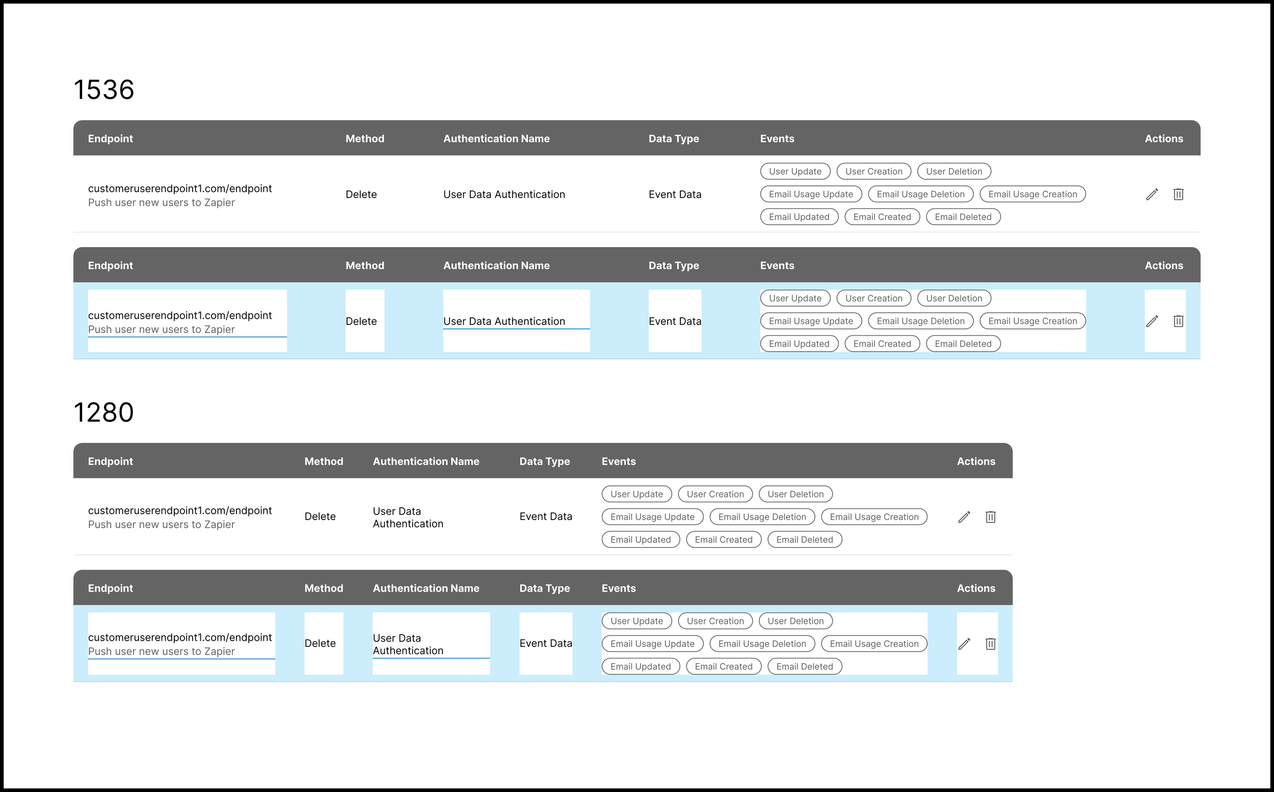 My initial wireframe allowed for in-line editing for all rows at any time. Users can type the Endpoint via an input field and select the Method and Authentication Type from dropdown menus. They can add Events via a dropdown menu, and each selected event will display as a pill.