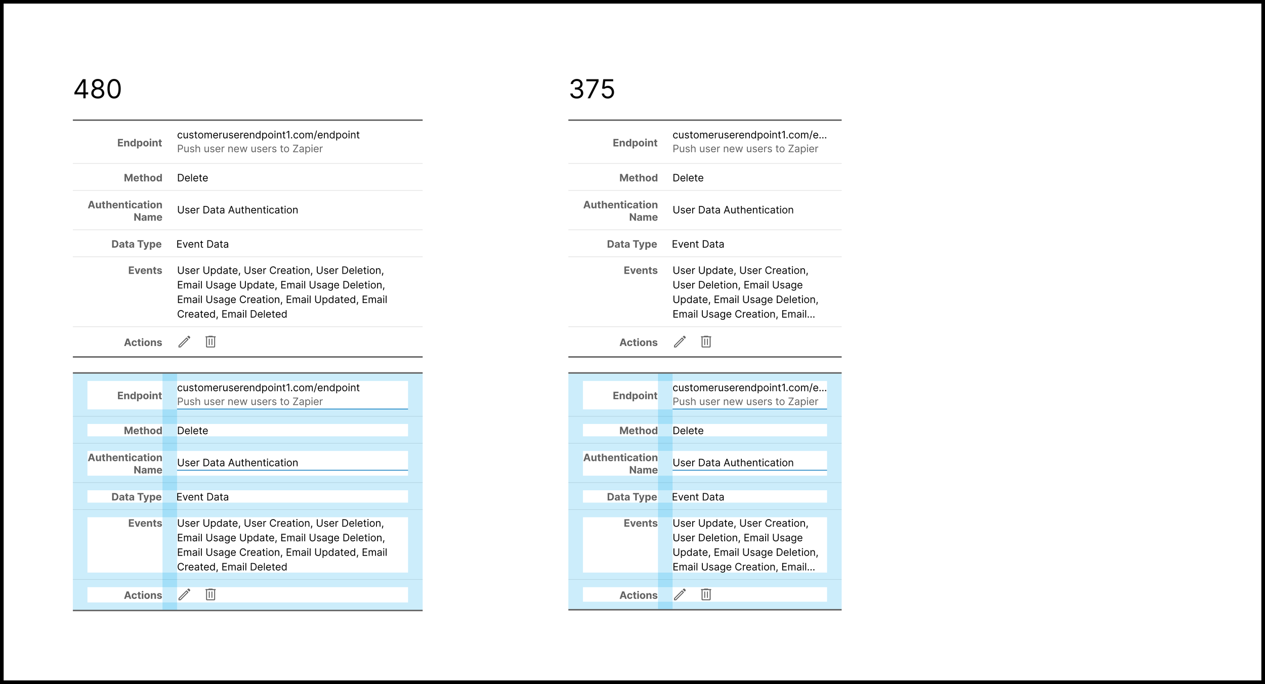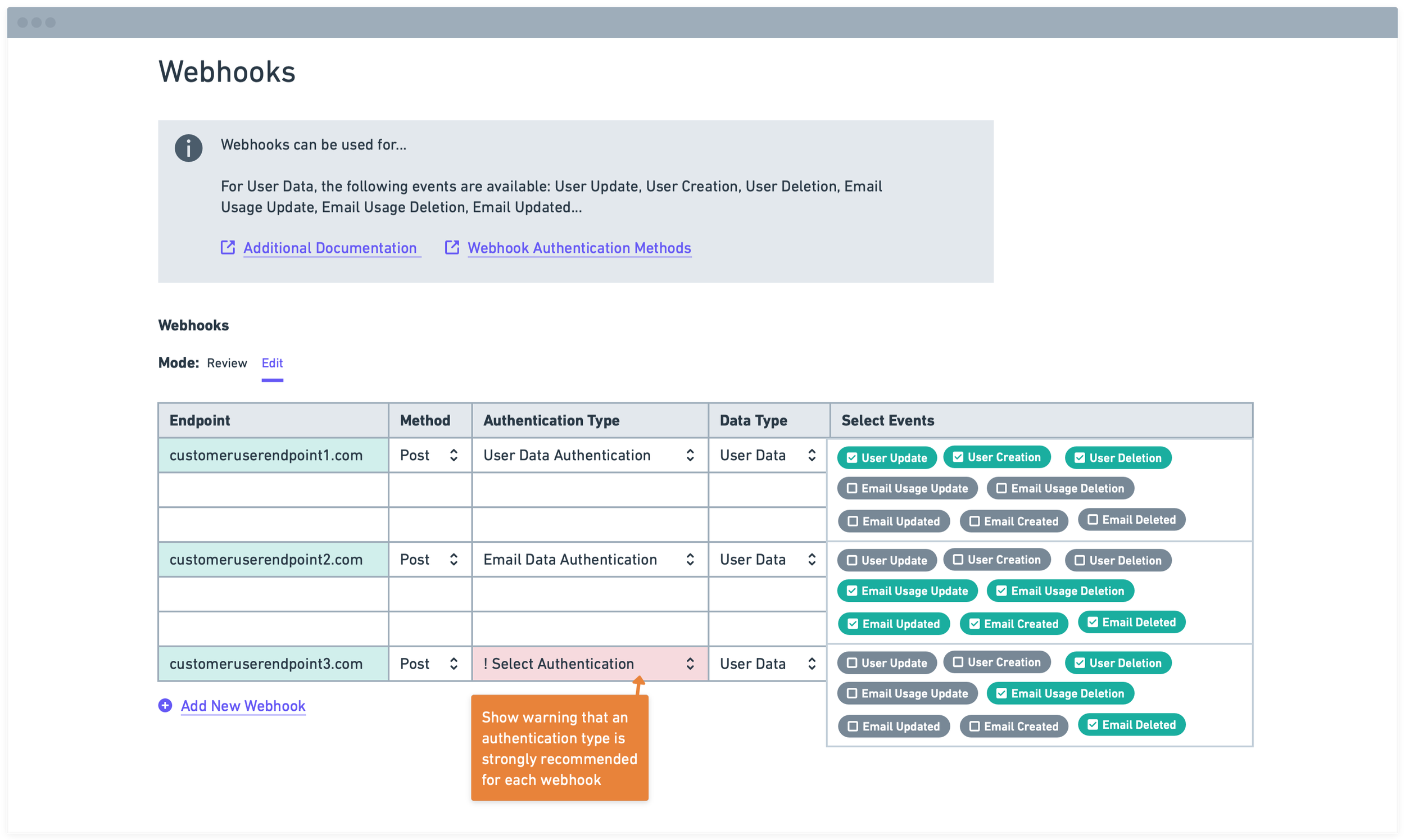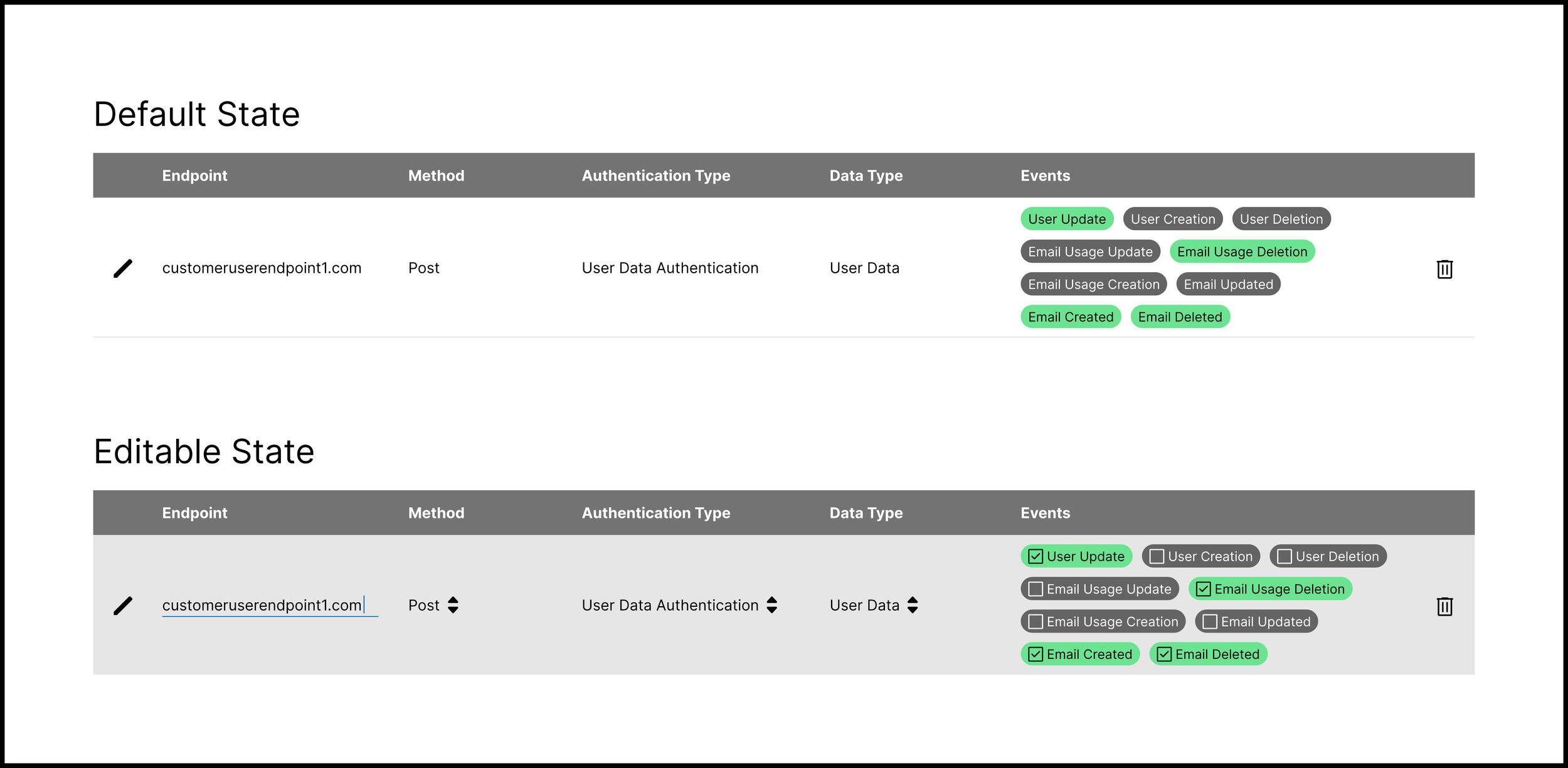 My initial wireframe allowed for in-line editing for all rows at any time. Users can type the Endpoint via an input field and select the Method and Authentication Type from dropdown menus. They can add Events via a dropdown menu, and each selected event will display as a pill.