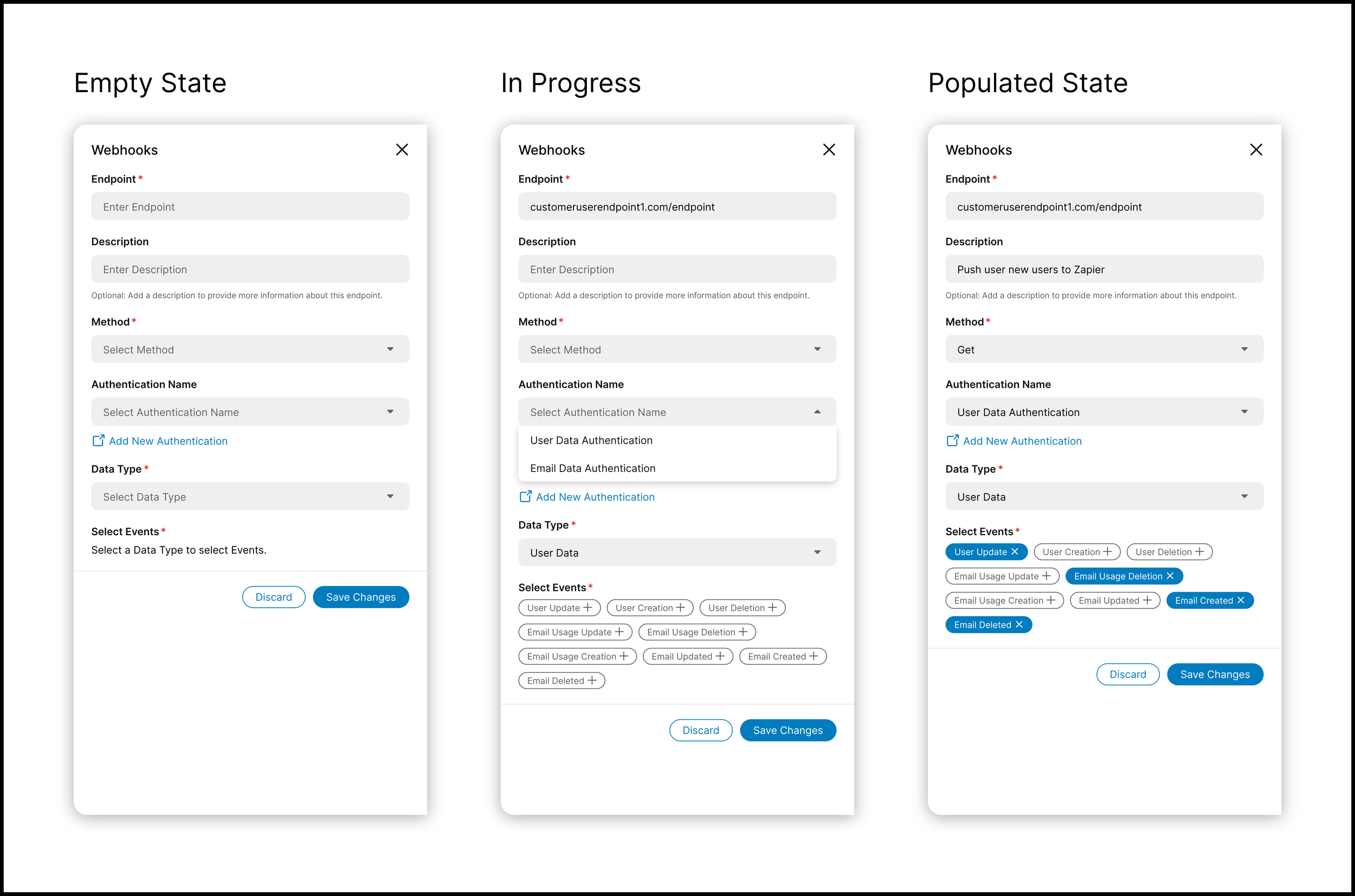 This iteration also included the addition of a new field: Data Type. The events available for each webhook would change depending on the selected Data Type.